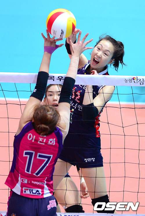 경기 2세트 인삼공사 백목화가 흥국생명 이진화릐 블로킹을 뚫고 공격을 시도하고 있다. / youngrae@osen.co.kr