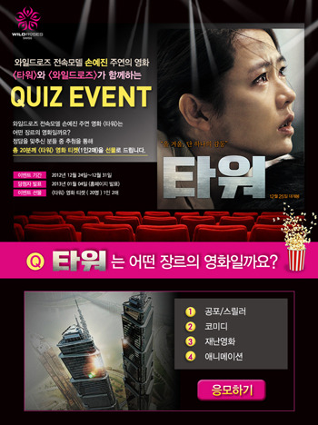 또한 와일드로즈의 홈페이지에서도 모든 회원을 대상으로 간단한 참여로 응모할 수 있는 '퀴즈 이벤트'가 준비돼 있다. 와일드로즈의 홈페이지 회원이 아니더라도 바로 가입이 가능하다. 참여 방법은 와일드로즈 홈페이지에서 영화 '타워'에 관한 간단한 퀴즈를 푼 후 응모 버튼을 누르면 이벤트에 자동 응모된다.