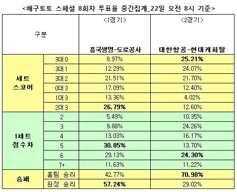 [배구토토] 국민체육진흥공단(www.kspo.or.kr)이 발행하는 체육진흥투표권 수탁사업자인 스포츠토토 공식 온라인 발매사이트 베트맨(www.betman.co.kr)이 23일 열리는 2012-13시즌 국내프로배구(V리그)를 대상으로 한 배구토토 스페셜 8회차 투표율 중간집계 결과, 국내 배구팬 70.98%는 대한항공-현대캐피탈(2경기)전에서 대한항공의 승리를 전망했다고 밝혔다.