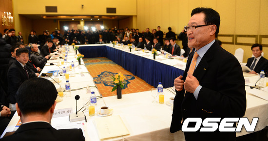 조중연 회장이 총회에 앞서 취재진에 인사를 하고 있다.