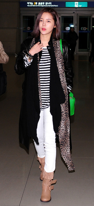 흰색과 검은색이 조화를 이루는 스트라이프 티셔츠, 평범한 실루엣의 블랙코트, 그리고 화이트 팬츠까지 주변에서 쉽게 볼 수 있는 아이템들이다. 여기에 컬러와 디테일이 돋보이는 백과 워커로 스타일 지수를 높인 박시연은 마지막으로 레오파드 패턴의 스카프를 목에 둘러 평범하지만 평범하지 않은 공항 패션을 완성했다.