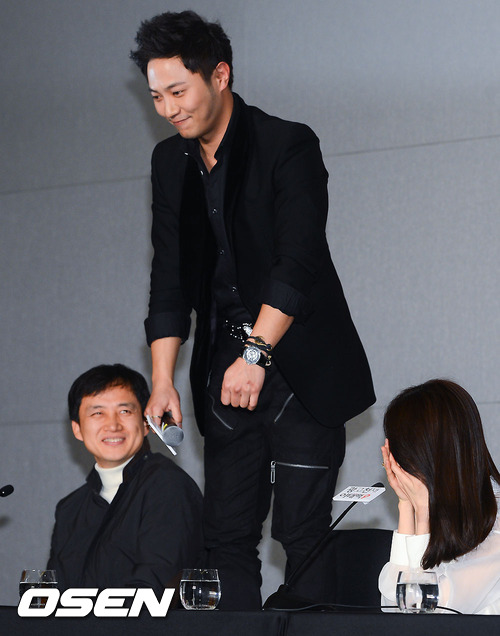 30일 오후 서울 여의도 콘래드 서울 호텔에서 진행된 KBS 2TV 새 월화드라마 ‘광고천재 이태백’ 제작발표회에서 배우 진구가 의자 위에 올라가 인사를 하고 있다