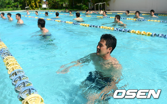 30일 오후(현지시간) 괌에 위치한 삼성 1차 전지훈련장에서 장원삼을 비롯한 투수들이 수영 훈련을 하고 있다.