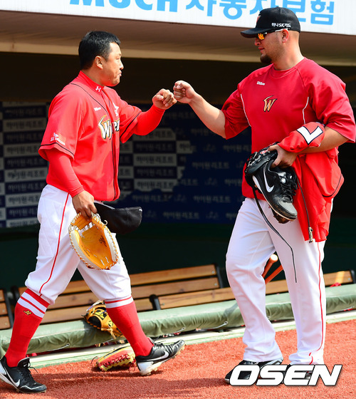 경기 전 SK 조인성과 조조 레이예스가 하이파이브를 하고 있다.