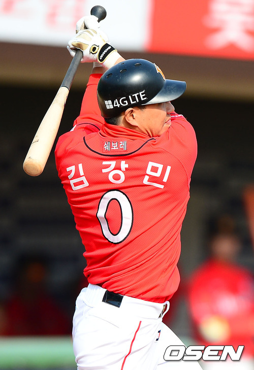 8회초 1사 주자 2루 SK 김강민이 1타점 적시타를 날리고 있다.