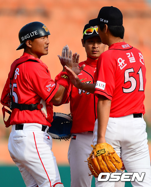 경기를 마치고 SK 허웅과 윤길현이 마운드 근처에 모여 하이파이브를 하고 있다. / rumi@osen.co.kr