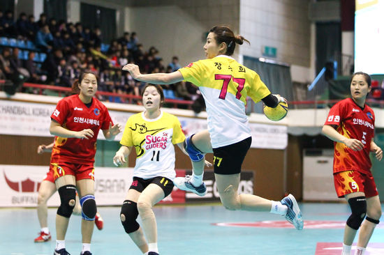SK 슈가글라이더즈는 21일 강원도 삼척체육관에서 열린 여자부 1라운드 인천시체육회와 경기에서 27-26으로 짜릿한 승리를 거뒀다. SK 슈가글라이더즈는 이날 승리로 3승 1패를 기록하며 인천시체육회와 공동 2위로 뛰어 올랐다.
