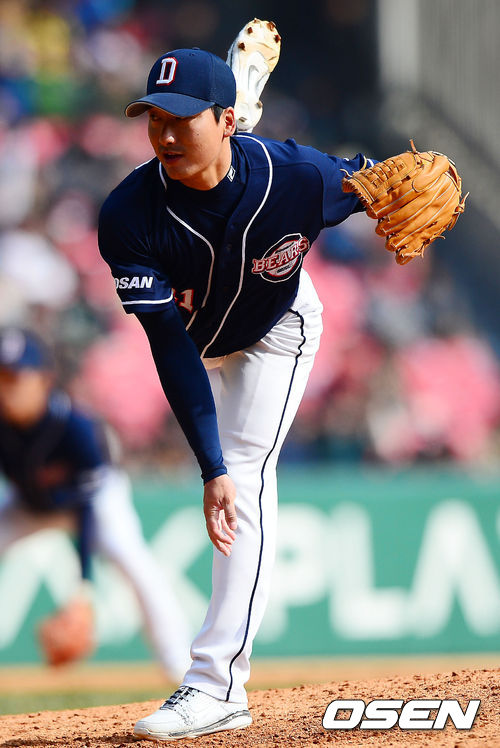 8회말 마운드에 오른 정재훈이 힘차게 공을 뿌리고 있다.