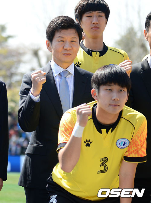 29일 경상북도 경산 영남대학교에서 열린 '2013 카페베네 U리그' 개막전 영남대와 부경대의 경기, 경기에 앞서 정몽규 대한축구협회 회장이 기념 촬영을 하고 있다.