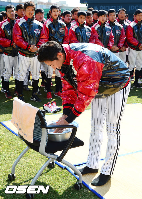29일 오후 서울 잠실구장에서 열린 LG 트윈스의 2013시즌 승리 및 안전 기원제에서 박용택이 손을 씻고 있다.