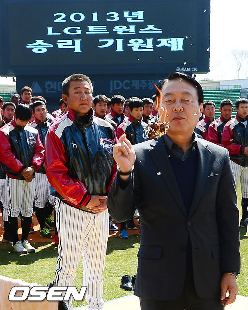 29일 오후 서울 잠실구장에서 열린 LG 트윈스의 2013시즌 승리 및 안전 기원제에서 LG 트윈스 전진우 사장이 축문을 태워 날리고 있다.