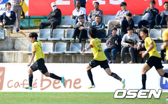 29일 경상북도 경산 영남대학교에서 열린 '2013 카페베네 U리그' 개막전 영남대와 부경대의 경기, 후반전 부경대 이예찬이 선제골을 성공시키고 환호하고 있다.