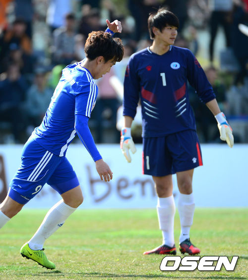 29일 경상북도 경산 영남대학교에서 열린 '2013 카페베네 U리그' 개막전 영남대와 부경대의 경기, 후반전 영남대 장순규가 역전골을 성공시키고 환호하고 있다.