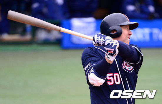 4회초 2사 만루 두산 김현수가 우월 만루 홈런을 날리고 있다.