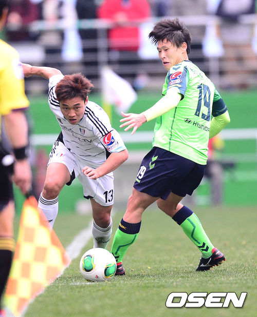 30일 오후 전라북도 전주시 반월동 전주 월드컵경기장에서 '2013 현대오일뱅크 K리그 클래식 4라운드' 전북 현대와 수원 삼성의 경기가 열렸다. 후반 수원 서정진이 전북 박원재의 수비를 뚫고 드리블 돌파를 시도하고 있다.