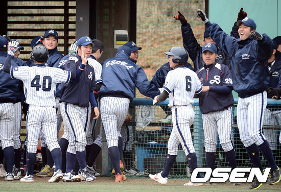 9회초 서울고 선수들이 임석진의 2타점 적시타로 역전에 성공하자 기뻐하고 있다.