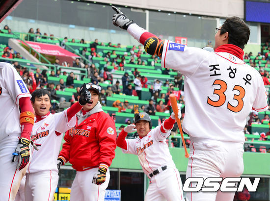 7회말 1사 2루에서 SK 조성우가 좌월 투런홈런을 날리고 동료선수들과 기뻐하고 있다.
