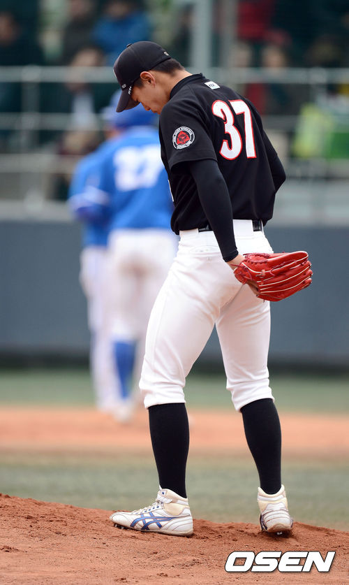 30일 오후 서울 신월구장에서 열린 '2013 고교야구 주말리그' 장충고와 경기고의 경기 1회초 1사 만루 장충조 홍경표가 밀어내기 볼넷으로 실점한 뒤 아쉬운하고 있다.