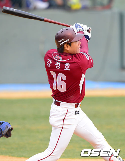 30일 오후 광주 무등구장에서 열린 '2013 한국야쿠르트 세븐 프로야구' KIA 타이거즈와 넥센 히어로즈의 경기 7회초 1사 1,2루 넥센 강정호가 역전 2타점 적시타를 날리고 있다.