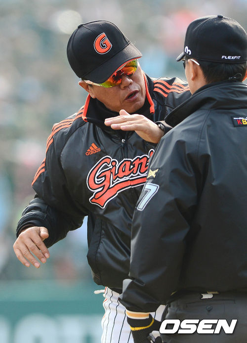 31일 오후 부산 사직구장에서 열린 '2013 한국야쿠르트 세븐 프로야구' 롯데 자이언츠와 한화 이글스의 경기 6회말 1사 만루 박종윤의 유격수 앞 땅볼 상황, 3루로 쇄도하던 2루주자 장성호가 아웃되자 김시진 감독이 오훈규 3루심에게 항의하고 있다.