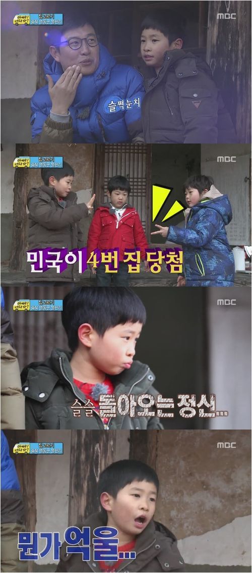 31일 방송된 MBC 예능프로그램 ‘일밤-아빠 어디가’는 스타와 스타자녀들이 집 고르기에 열중하는 모습이 그려졌다. 앞서 송종국, 이종혁, 윤민수가 가위바위보에서 이기면서 무난한 집을 고른 가운데 남은 성동일과 김성국은 점점 불안해지기 시작했다.