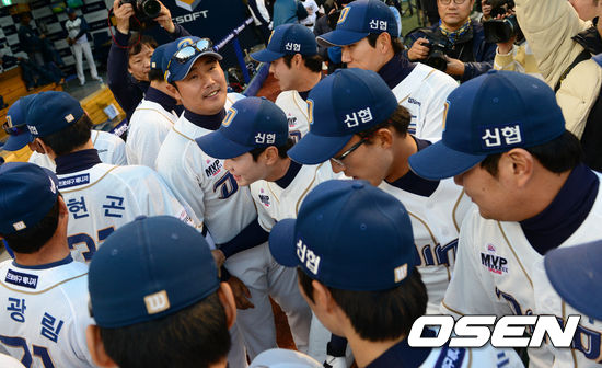 2일 오후 창원 마산구장에서 열린 '2013 한국야쿠르트 세븐 프로야구' NC 다이노스와 롯데 자이언츠의 경기 시작 전 NC 선수들이 화이팅을 외치고 있다.