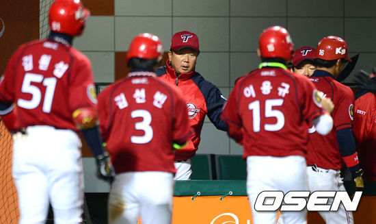 3회초 2사 1,2루에서 KIA 김주찬의 역전 적시타 때 선동렬 감독이 덕아웃에서 홈을 밟은 선수들을 축하하고 있다.