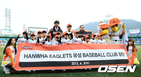 경기에 앞서 열린 유성베이스볼클럽 창단식에서 박찬호, 정승진 한화이글스 사장, 어린이 선수들이 기념촬영을 하고 있다.
