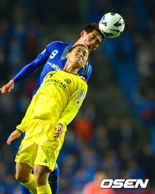 3일 오후 경기도 수원시 수원월드컵경기장에서 열린 2013 아시아축구연맹(AFC) 챔피언스리그 H조 수원 삼성과 가시와 레이솔의 경기 전반 수원 오장은이 가시와 타나카와 공중볼을 다투고 있다