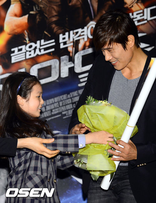 5일 오후 서울 용산CGV에서 진행된 '지.아이.조2' 이병헌 무대인사 및 관객대화에서 이병헌이 꼬마팬에게 꽃다발을 건네받고 있다.
