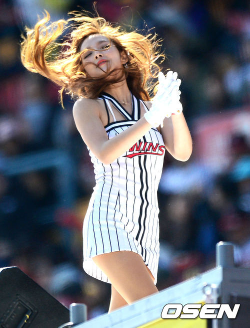 LG 치어리더 강윤이가 열띤 응원을 하고 있다.
