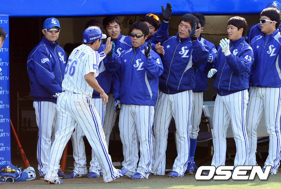 7일 오후 대구구장에서 열린 '2013 한국야쿠르트 세븐 프로야구' 삼성 라이온즈와 NC 다이노스의 경기 5회말 2사 1,2루 배영섭의 1타점 적시타에 홈을 밟은 2루주자 이지영이 덕아웃에서 동료들과 하이파이브를 하고 있다.