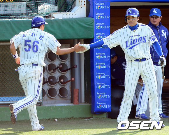 7일 오후 대구구장에서 열린 '2013 한국야쿠르트 세븐 프로야구' 삼성 라이온즈와 NC 다이노스의 경기 5회말 2사 1,2루 배영섭의 1타점 적시타에 홈을 밟은 2루주자 이지영이 이승엽과 하이파이브를 하고 있다.