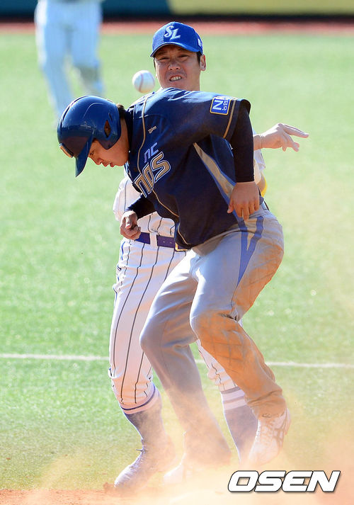 7일 오후 대구구장에서 열린 '2013 한국야쿠르트 세븐 프로야구' 삼성 라이온즈와 NC 다이노스의 경기 7회초 무사 1루 이현곤의 내야 땅볼, 조동찬이 2루에서 권희동을 포스아웃 시킨 후 1루로 송구하고 있다. 1루에서는 세이프.