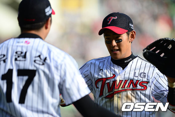 7회초 2사 1,2루에서 LG 정주현이 두산 김현수의 안타성 타구를 몸 날려 잡아내고 유원상의 격려를 받고 있다.