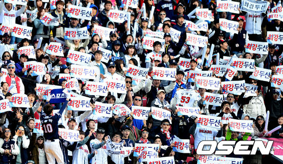7회초 두산이 동점에 성공하자 팬들이 열광하고 있다.