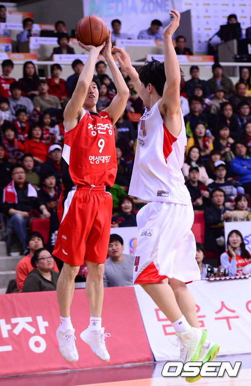 2쿼터, KGC 정휘량이 SK 최부경의 수비를 받으며 3점슛을 시도하고 있다.