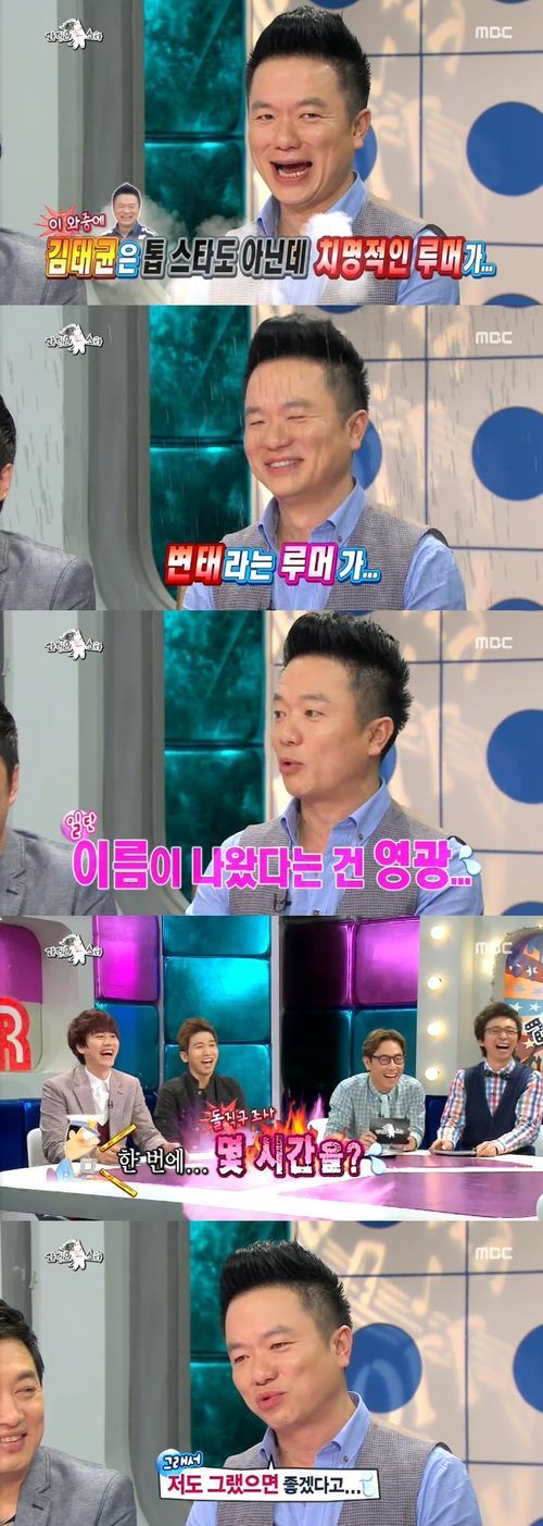 MC들이 "김태균은 톱스타도 아닌데 변태라는 치명적인 루머가 있는데?"라고 물었다. 이에 김태균은 "오래전 얘기인데 정확한 내용을 안다"며 "찌라시에 내 이름이 나왔는데 영광이다. 거기엔 톱스타들 이름만 올라가니까"라고 말했다.
