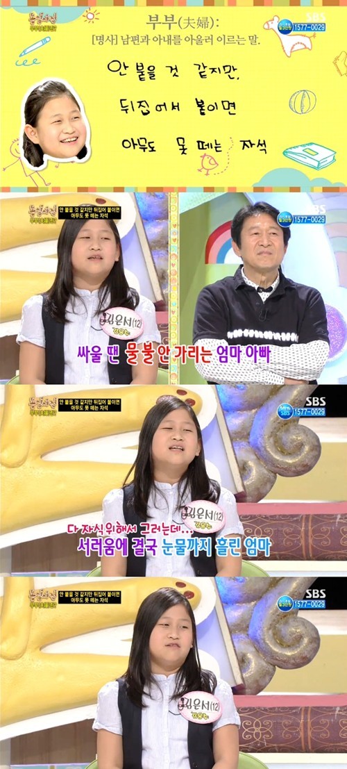 은서 양은 11일 방송된 SBS '스타주니어쇼 붕어빵'(이하 붕어빵)에서 "엄마와 아빠는 같은 극 자석처럼 안 붙을 것 같다가도 다음 날이 되면 붙어 있는다"라고 말했다.