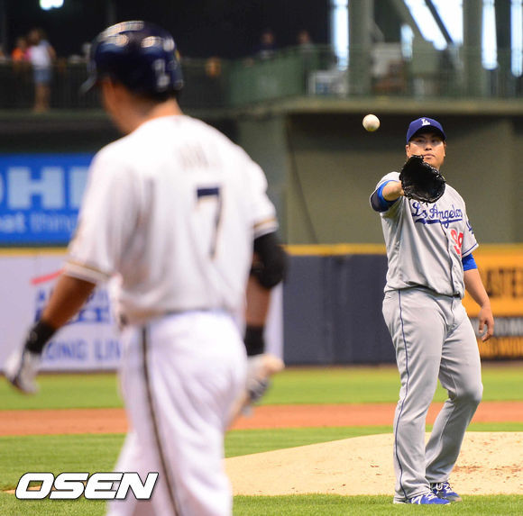 LA 다저스 류현진(26)이 밀워키 브루어스 일본인 타자 아오키 노리치카(31)와 투타 맞대결에서 장군멍군을 주고받았다.
