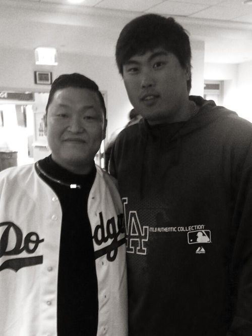 가수 싸이가 야구선수 류현진과 함께 나란히 선 사진을 공개했다.