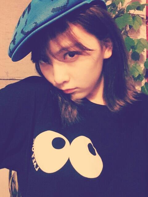 사진 속 강지영은 눈알이 그려진 검정색 티셔츠를 입고 머리에는 초록빛이 나는 독특한 베레모를 쓴 채 패션 센스를 과시하고 있다. 카메라를 노려보고 있는 강지영의 익살맞은 모습이 귀여움을 자아낸다.