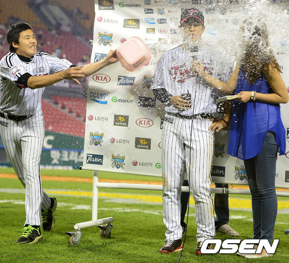 KBS N 정인영 아나운서는 지난 26일 서울 잠실야구장에서 열린 '2013 한국야쿠르트 세븐 프로야구' LG 트윈스-롯데 자이언츠 경기종료 후 MVP로 뽑힌 LG 정의윤을 인터뷰하던 중 LG 임찬규에게 물벼락을 받았다.