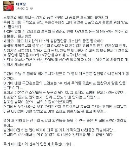 이어 이효종 KBS N 편성팀장은 27일 새벽 자신의 SNS에 “도대체 기본적인 소양교육은 누구의 몫인가. 창조할 능력이 없으니 남의 것을 따라했겠지만.(중략) LG팬들에게 죄송하지만 KBS N에서 더 이상 경기 후 LG선수 인터뷰를 볼 수 없을 것”이라고 밝혔다. 이는 중계방송사 편성팀장의 발언이라는 점에서 파장이 더 클 것으로 보인다.