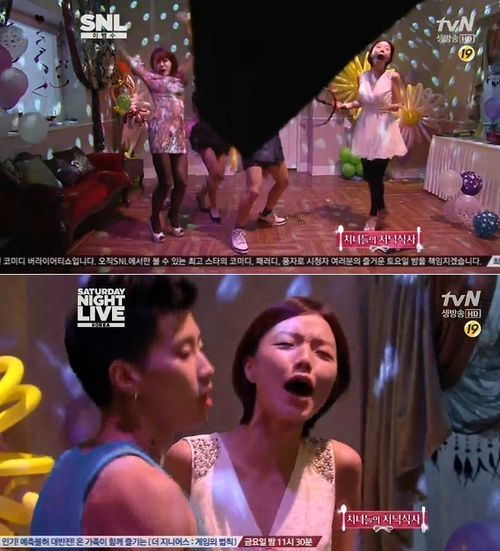 지난 15일 방송된 'SNL코리아' 콩트 '처녀들의 저녁식사'에서는 시청자들이 깜짝 놀랄 만한 돌발상황이 벌어졌다. 결혼을 앞둔 안영미의 파티 모습이 진행되고 있었고 파티에는 박재범이 깜짝 손님으로 등장해 춤을 췄다.