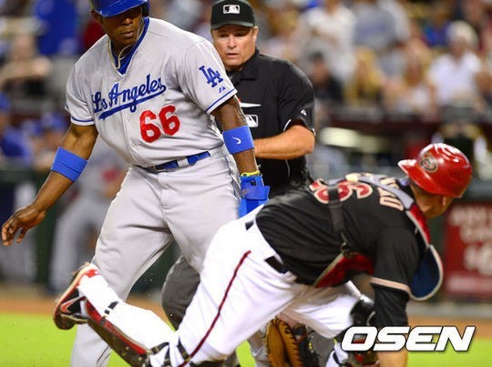이후 특별한 장면은 없었지만 지난달 얼굴에 공을 맞았던 푸이그는 당시 고통을 아직도 잊고 있지 않았다. 5회 무사 만루에서 아드리안 곤살레스의 중견수 뜬공을 애덤 이튼이 실책으로 놓쳤다. 2,3루 주자가 홈을 밟은 가운데 1루에 있던 푸이그는 스타트가 늦어 득점이 어려운 상황이었다. 하지만 푸이그는 작정한 듯 홈으로 파고들어 공을 받고 기다리고 있던 애리조나 포수 미겔 몬테로와 정면 충돌했다.
