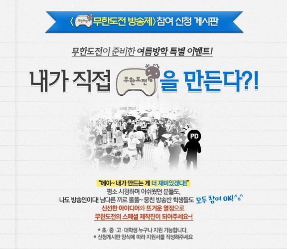 여름방학 특집으로 기획 된 ‘무한도전 방송제’에 전국의 초-중-고교생과 대학생을 제작에 참여시키는 프로젝트다.