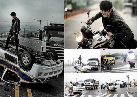 그는 17일 공개된 티저 포스터에서 완전히 뒤집어진 경찰 호송차 위에서 강렬한 카리스마를 발산하고 있다. 티저 포스터는 살인 누명을 쓴 장태산이 경찰차로 호송되던 중 교통사고가 난 장면을 배경으로 한 것. 함께 공개된 사진 속 이준기는 오토바이를 타고 탈주하는 순간을 표현했다.