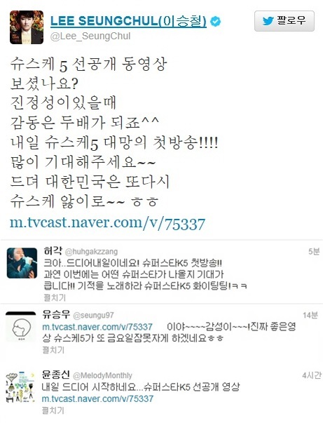 먼저 이승철은 “드디어 대한민국은 또 다시 슈스케 앓이로~"라는 글을 올렸으며 윤종신도 “내일 드디어 시작하네요”라며 이날 오전 11시 네이버TV캐스트를 공개된 '슈퍼스타K 5' 선공개 영상을 소개했다.