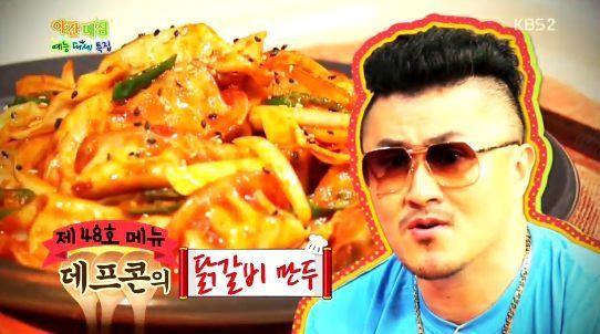 [OSEN=이슈팀] 가수 데프콘의 닭갈비만두가 화제다. 쟁쟁한 후보들의 쟁쟁한 음식들을 제치고 당당히 최고 점수를 받았다.데프콘의 닭갈비만두는 지난 22일 오후 11시 20분 방송된 KBS 2TV '해피투게더3'에서 야간 메뉴로 등극했다. 경쟁자였던 박형식과 김예림의 걸작(?)들을 제쳤다. 박형식은 ‘맛다시 볶음밥’으로 호평을 받았고 조정치 대신 요리에 나선 김예림은 ‘쿠키튀김’으로 칭찬을 받았지만 데프콘의 ‘닭갈비 만두’에는 못미쳤다.